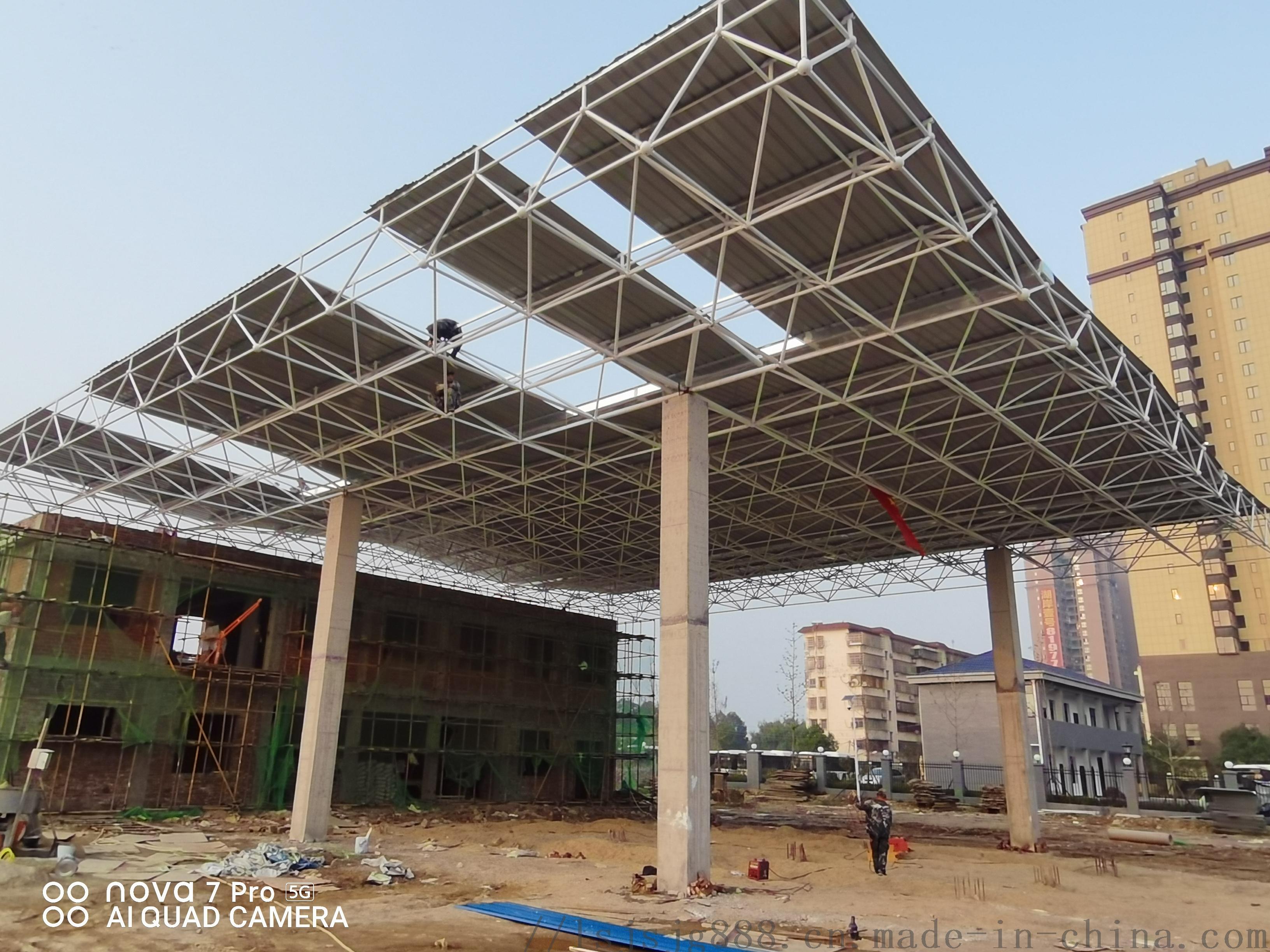 网架结构加油站的造型通常十分规整简单。方正的顶棚与立柱构成了结构的主体。顶棚的周边一般采用铝塑板、喷绘布装饰,上平面用一般用彩钢板遮盖,下平面设置照明器具,可以不做天花板,如用天花板,一般采用铝扣板。网架结构的用钢量小,零件都是工厂预制件,安装方便,施工时间很短。非常适合工期紧,需要短时间投入运营的加油站工程。